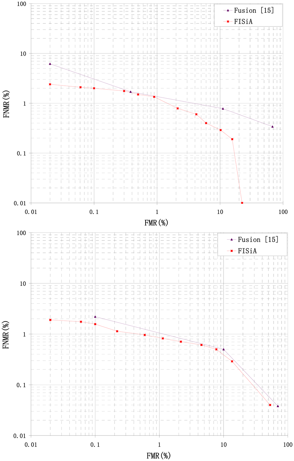 FISiA is designed for the purpose of specific fingerprint authentication. In order to thoroughly compare with the fusion method in [15], another experiment was performed on the FVC2002 DB1 and DB2 according to the standard guideline given in [19]. The total matching on the database comprised of 2,800 genuine matches and 4,950 imposter matches. The comparison of error matching rates among FISiA and the fusion method of SIFT and minutia-based method in [15] are presented in Table 4. The average matching speed, including feature extraction is also given. The ROC curves obtained on FVC2002 DB1 and DB2 using Reference [15] and FISiA are shown in Figure 13. The improvement in the error rate of FISiA is attributable to proper image processing, descriptor definition and thew optimization of the original SIFT matcher, i.e., SIFT-based Minutia Descriptor (SMD). The improvement in the speed of FISiA can be resulted from the decrease of the number of descriptors and the strategy of two-step fast matching, i.e., improved All Descriptor-Pair Matching (iADM).