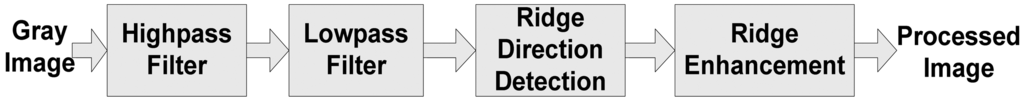 The SIFT descriptor becomes unstable in the presence of variations in finger pressure or differences in skin characteristics. Therefore, the gray-scale fingerprint images without pre-processing are not proper for original SIFT extraction. Filters are used to process the original fingerprint image to derive an enhanced gray image. Figure 3 shows the image processing flow employed in FISiA. It can be partitioned into the following major stages: highpass filter, lowpass filter, ridge direction detection, and ridge enhancement.