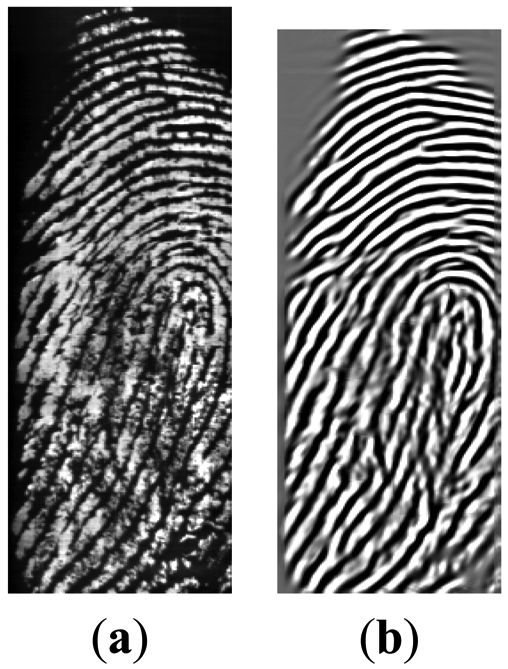 The highpass filter is used to perform the brightness calibration. If the gray value of the image at position (x,y) is denoted by I(x,y), the calculation of highpass filter IH(x,y) is computed in Equation (1) where the size of highpass window k is selected as 16 and the bias value b equals 128. It calculates average intensity within k × k window and subtracts average from the center pixel biased at b. The lowpass filter IL(x,y) is used to decrease noise as described by Equation (2), where the sizes of two lowpass windows m and n are selected as 4 and 2, respectively. The reason that lowpass filter uses two windows and uses the average of two averages is that the pixel in the smaller window is more similar to the target pixel. After accurate ridge detection for each pixel using look-up table is performed, the ridge direction detection for each block (8 × 8) can be estimated. The details can be found in [16]. The ridge enhancement [17] with a Gabor-like filter can be performed to enforce the fingerprint pattern. It removes low frequency components along the direction orthogonal to the ridge direction. One example of the preprocessed image is shown in Figure 4: