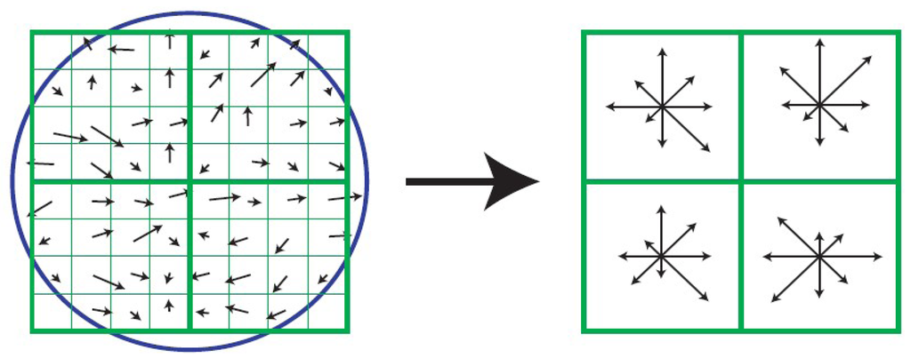 The SIFT descriptor are calculated based on the processed image in Section 2.1. The skeleton image should not be used to extract minutiae because the texture information needed by the SIFT operator are removed in the skeleton image. A SIFT descriptor [10,11] is proposed by computing the gradient magnitude and orientation at each point in a region around the sampling point as shown on the left of Figure 5. These samples are then accumulated into orientation histograms summarizing the contents over the sub-regions as shown on the right of Figure 5. The proposed descriptor consists of the SIFT descriptor of the minutia and SIFT descriptors at several sampling points around the minutia.