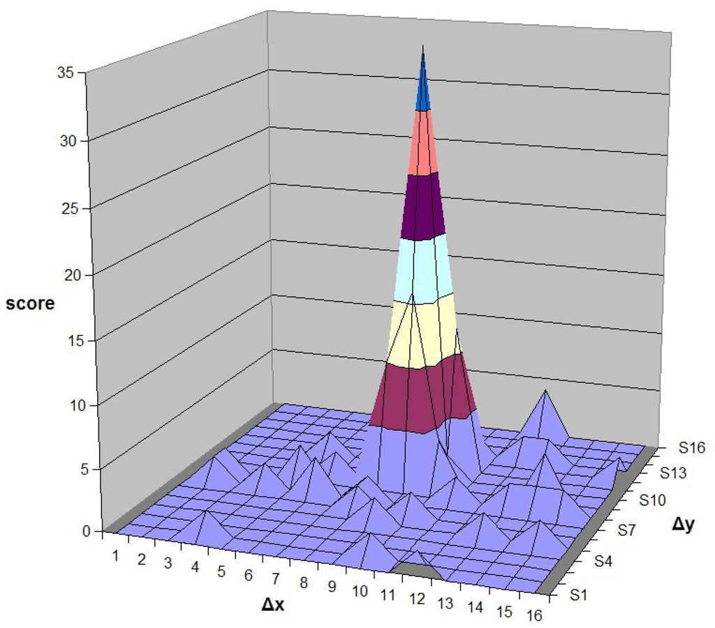 In the second step, the local search is applied. Only the SIFT descriptor of sampling points around minutiae are used for local matching. In the similar way, the matching is performed by employing the Hough Transform for all closest pairs calculated by Euclidean Distance in this local area. A small 2-D accumulator array C, with (Cx, Cy) as the center, is employed to accumulate the score. The descriptor pairs that have displacement vectors outside of C are not required to calculate the Euclidean Distance. Notably, there are four sampling SIFT descriptors for each minutia which are rotation invariant. Therefore, the sampling SIFT descriptor only match with the descriptors of its own class. For example, {S0(m0), S0(p1), S0(p2), S0(p3)} belong to one minutia of Image #0 while {S1(m0), S1(p1), S1(p2), S1(p3)} belongs to one minutia of Image #1. S0(p1) only needs to match with S1(p1), the Euclidean Distance computation of both (S0(p1), S1(p2)) and (S0(p1), S1(p3)) are not required. The distribution of scores in the array C is obtained as shown in Figure 8. The value of the peak is searched from this distribution of scores and considered as the final matching score. In our experiment, the size of C is selected as 16.