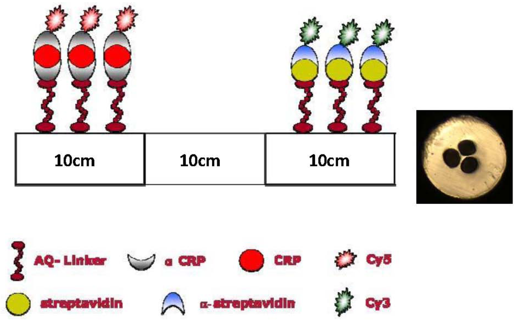 In contrast to PMMA, TOPAS is chemically inert and thus biomolecules are not easily immobilized onto it. However, commercially available anthraquinone (AQ) photolinkers (see www.exiqon.com) can attach to the TOPAS surface when activated by UV light and can subsequently accept sensor layers. This concept was used to develop the first flourescence-based TOPAS mPOF antibody biosensor, which had a reasonable selectivity [21,22]. Here we for the first time take full advantage of the chemical inertness of TOPAS and the AQ-linker technology and present the first fluorescence-based serial fiber-optical biosensor capable of selective detection of two different antibodies with a single fiber.