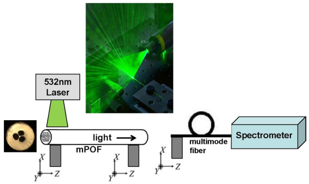 The optical characterization was carried out using a simple fluorescence setup shown in Figure 2, where the input 7 cm part of the mPOF is illuminated from the side by a 7 cm by 100 μm line-shaped beam from a 532 nm laser, as also used in [19,21,22]. Some of the light tunnels into the fiber core and is guided to the output end of the fiber, where it is detected with a spectrum analyzer. For this initial proof-of principle test the side-illumination works fine, while for future advance sensor characterizations conventional incoupling will be used. If the sensor functions as anticipated, then the 532 nm light should be able to excite the Cy3 fluorophores and the emission of Cy3 should just be able to excite the Cy5 fluorophores, allowing to detect the presence of both antibodies in one measurement.