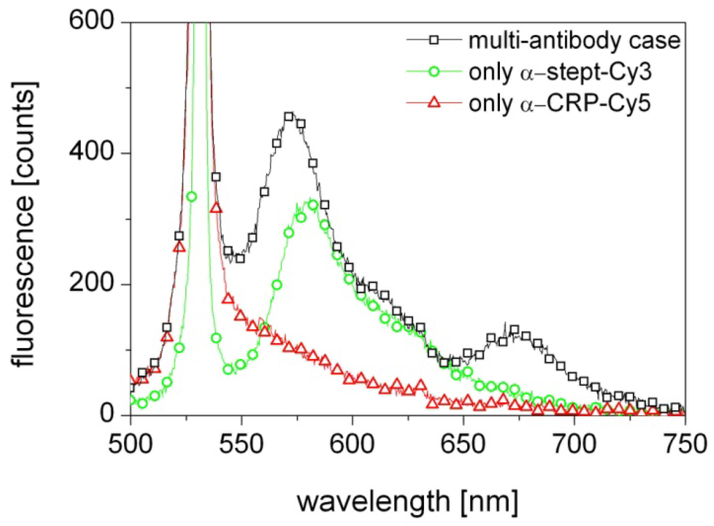 The results presented in Figure 3 (black squares) show indeed excitation of both Cy3 and Cy5, which means that the biosensor correctly detects the presence of both α-streptavidin and α-CRP antibodies in the probed solution. As the laser wavelength is close to the absorption line of the Cy3 flourophore the contribution from Cy3 is strong. In contrast, the 649 nm absorption line of Cy5 is far from the 570 nm emission line of Cy3 and the 532 nm laser wavelength and thus its excitation is weak. Most likely the Cy5 excitation is primarily due to the light emitted from Cy3 in the first section being guided through the fiber to the other end with the Cy5.