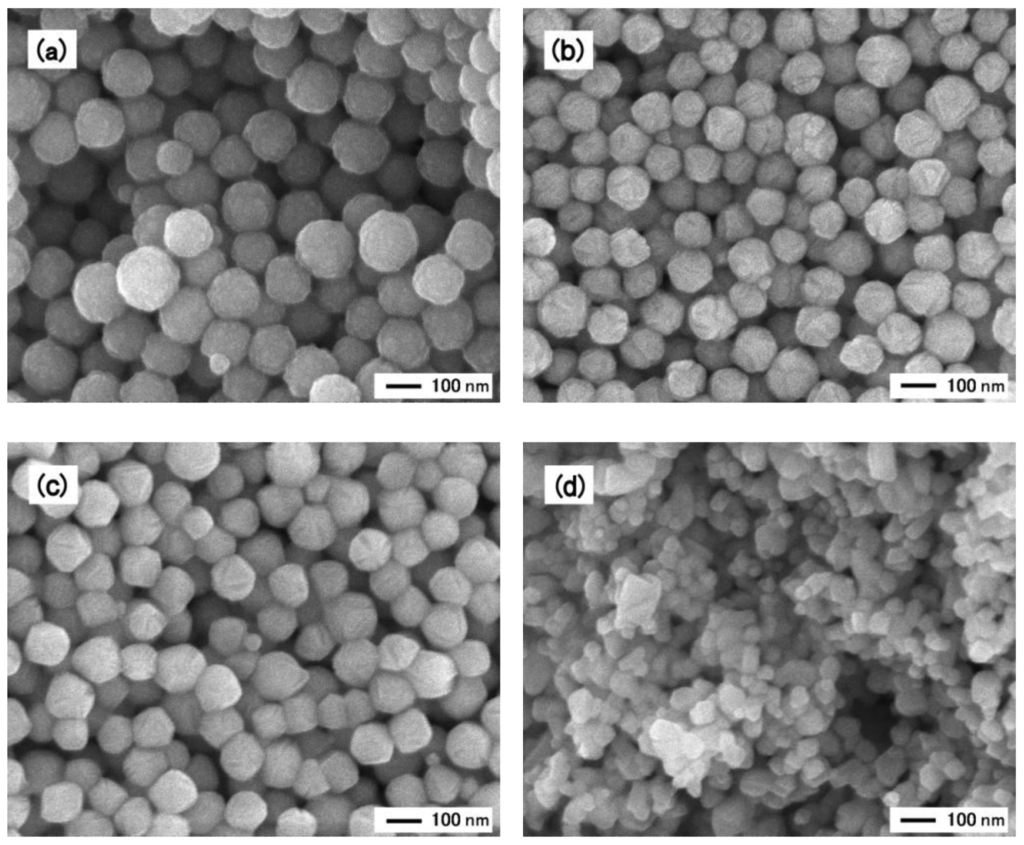 The thick films obtained after the firing of the substrates at 900–1,000 °C had a porous structure, which consisted of spherical nanoparticles (Figure 1(b,c)). The average size of the nanoparticles at both 900 °C and 1,000 °C was approximately 120 nm, and it decreased as the substrates were heated to 900–1,000 °C. This was attributed to the decomposition of the shell structure after the heat treatment at temperatures 900 °C or higher, which suggested that after the thick films had been fired, the constituent nanoparticles did include a core.