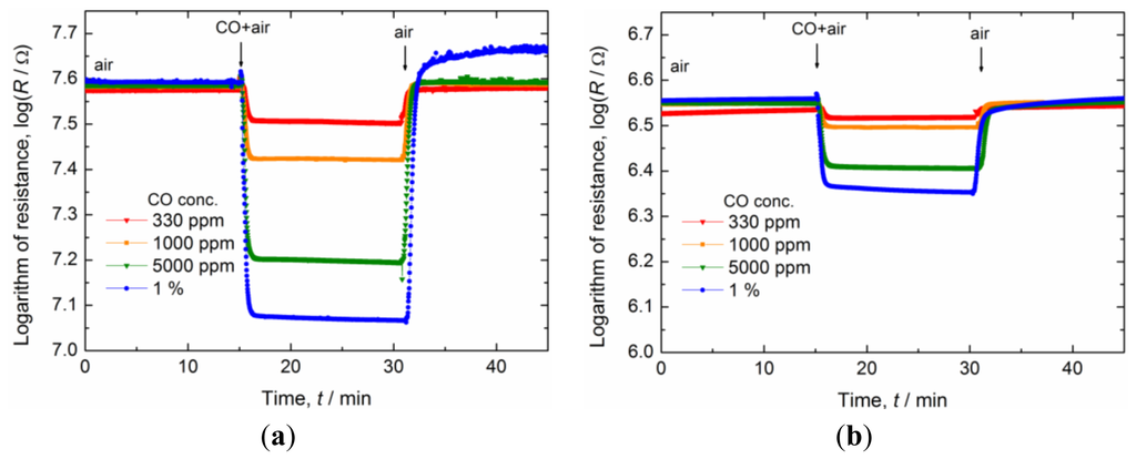 Figure 2 shows the typical responses of a sensor fabricated using the core-shell nanoparticles-based thick film that was fired at 900 °C (Figure 1(b)) and those of a sensor fabricated using the precipitated nanoparticles-based thick film that was fired at 950 °C (Figure 1(d)). The responses were measured in air containing CO in various concentrations, with the operating temperature being 450 °C. After switching to air containing CO, the resistance between the Pt electrodes in the sensors decreased. On switching back to CO-free air, the resistance returned to approximately its original value. These response curves were almost the same as those reported earlier [6,7].