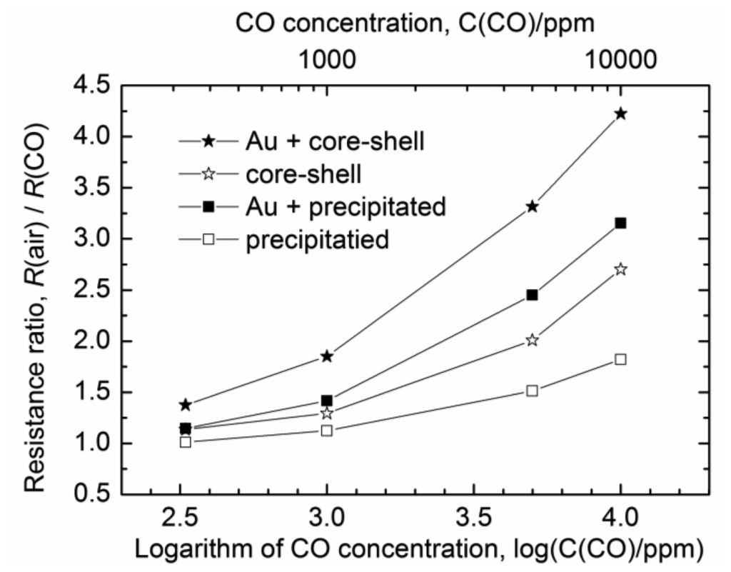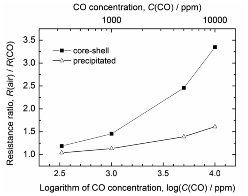 Figure 3 shows the relationship between the response, S, and the CO concentration in the tested air sample at an operating temperature of 450 °C. For comparison, the response curve of the sensor fabricated using the precipitated nanoparticles is also shown. The response of the sensor based on the core-shell nanoparticles was markedly higher than that of the sensor prepared using the precipitated nanoparticles. The reason for this significant difference in the two responses is discussed later.