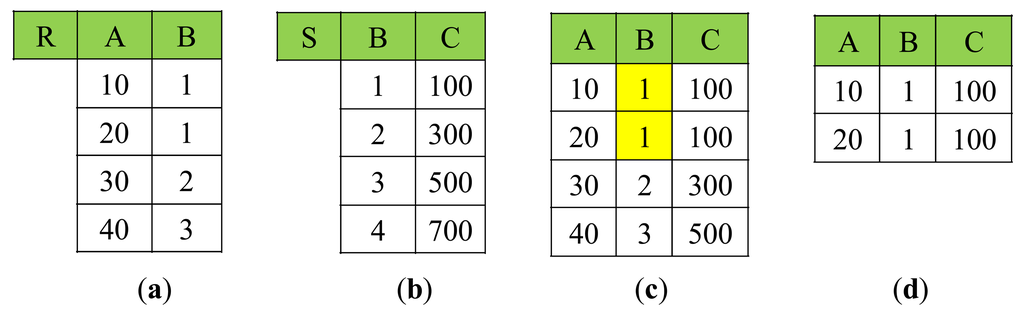 - Mishra, P.; Eich, M.H. Join processing in relational databases. ACM Comp. Surv. 1992, 1, 63–113. [Google Scholar]