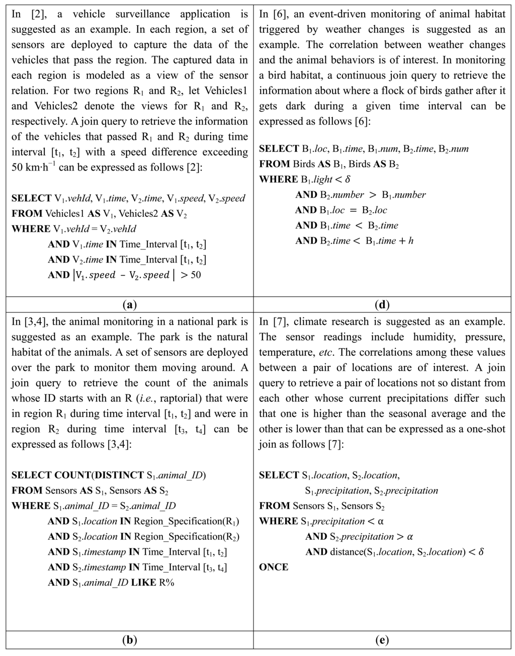 A query joining sensor readings can be declaratively expressed against the sensor relations in SQL-like syntax as shown in the previous section and in Figure 1. The sensor relations and/or its views are listed in the FROM clause as join operand relations. For example, in the query expressions in Figure 1(b,d,e), the sensor relations are directly queried. In the query expressions in Figure 1(a,c,f), views of the sensor relation are queried. The join predicates of interest are specified in the WHERE clause often with selection predicates. Each predicate is either on the sensor attributes or on the auxiliary attributes. In the query expression in Figure 1(d), for example, there are five predicate conditions in the WHERE clause: The first one (B1.light < δ) is a selection predicate on a sensor attribute light. The second one (B2.num > B1.num) is a join predicate on a sensor attribute num (i.e., number). The remaining three (B1.loc = B2.loc; B1.time < B2.time; B2.time < B1.time + h) are join predicates on auxiliary attributes loc (i.e., geographic location of a sensor node) and time (i.e., timestamp of a sensor tuple). The predicates on sensor attributes are the ordinary ones used in the conventional database queries. The predicates on auxiliary attributes add spatial as well as temporal characteristics to the join queries in WSNs.