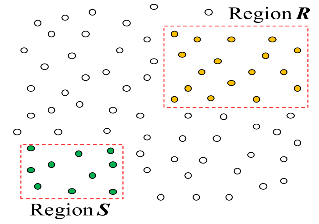 ) covers a fixed region of the network denoted as R (S), such type of join is an inter-region join. An instance of an inter-region join is shown in Figure 2. In an inter-region join R ⨝ S, it is typical that regions R and S do not overlap with each other as shown in Figure 2. An important property of an inter-region join is that a node that has received an inter-region join query can determine if it is to participate in the query without communicating with other nodes. The processing of an inter-region join has received so far the most attention in the literature [2–5,8,11,12,20,21], and several techniques that are suitable for such a join type have been proposed.