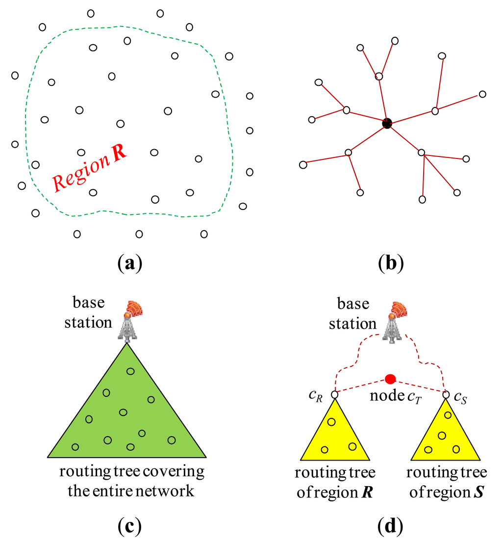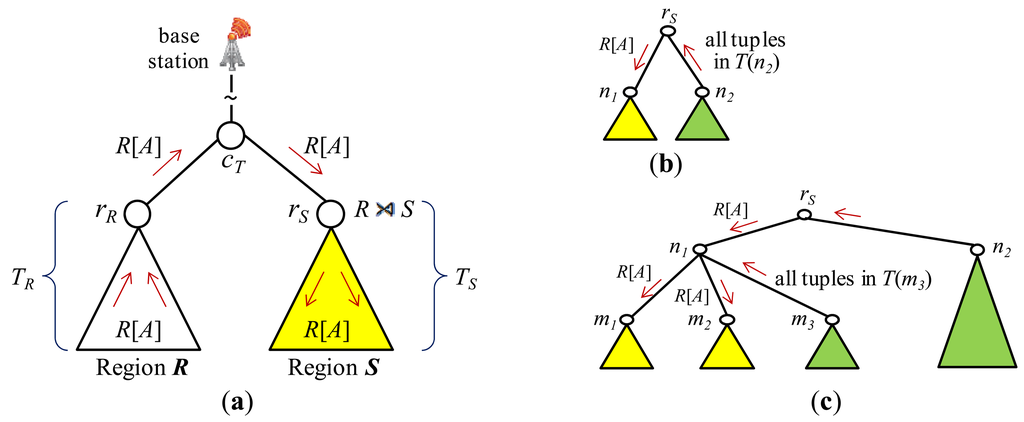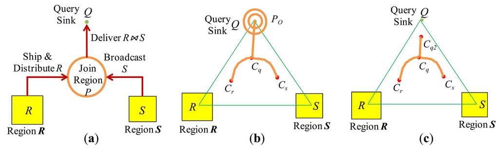 The query sink where a join query is submitted is either the base station or a node inside the network. The query message is supposed to be delivered to every node of the network. For an inter-region join R ⨝ S, however, the query message can be routed to the center coordinates of region R (S) using a location routing protocol like GPSR. The query is received at the sensor node cR (cS) nearest to the center coordinates of region R (S). In region R (S), a routing tree whose root is cR (cS) is constructed (Figure 3(d)) using the standard method of [25] while the query is disseminated in the region.