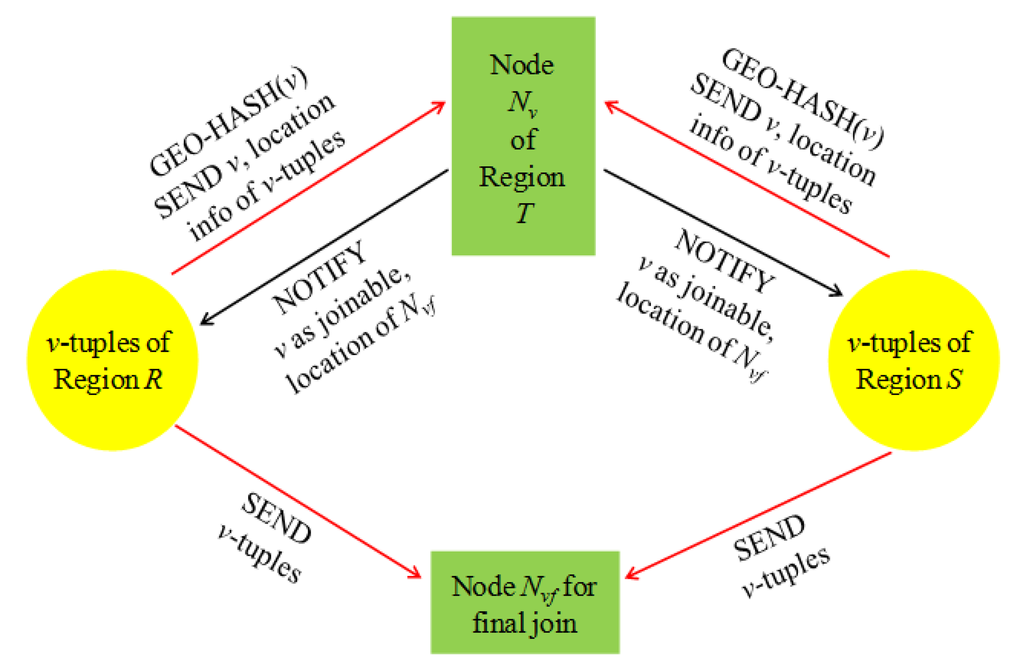 In [5], Lai et al. proposed PEJA to answer a continuous join query. It executes an inter-region equi-join R ⨝A=B S. The join processing proceeds as follows: In region R (S), a routing tree is constructed. In R (S), the value range of A (B) is divided into subranges. Each node of R (S) counts the number of value occurrences in R.A (S.B) for each subrange, making the node histogram which consists of a series of (subrange, count) pairs for that node. The node histograms are gathered at the root through the routing tree, and the root merges them to generate the region histogram which consists of a series of (subrange, count) pairs for that region. The two region histograms are sent to the node cT, which is located at the midpoint between the two roots of the routing trees. In cT, for each matching subrange pair, joinability for the subrange is checked. For example, if the count of a subrange [v1, v2] is not 0 in one region but that of the same subrange of the other region is 0, then there would be no join result for the subrange [v1, v2]. If both counts are non-zero, the join result is regarded to exist for [v1, v2] though this judgment would turn out to be a false hit. For the non-joinable subranges, the corresponding tuples of R and S are filtered out. Because of the false hits, such reductions of R and S are only partial. For each pair of joinable subranges, a strategy of in-network join processing is set up depending on the two counts. For example, if one count is high but the other one is very low, then the probability of the join result to be produced in that subrange could be low. If both counts are high, the probability could be high. Based on such a heuristic, a proper join strategy is selected and executed as follows.