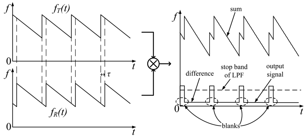 The output of a basic CTFM system includes a blank in every sweep period. The blank appears at the start of a sweep period with a length of τ. Such blanks are called “blind time,” they make the output discontinuous and decrease output signal energy. A dual demodulation method has been brought out to eliminate blind time [17]. An additional sweep signal, with a sweep rate equal to m and a band next to the band of ST(t), is introduced in the demodulation procedure. The additional sweep signal is described as: