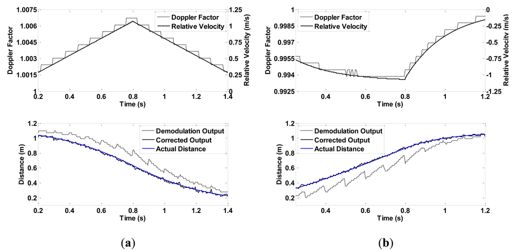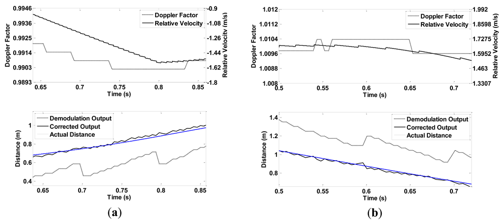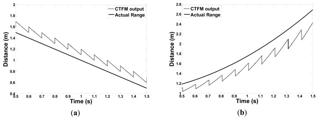 Obviously, f̂α no longer follows Equation (6). Figure 5 demonstrates two moving conditions, deviations occur between the CTFM output and the actual target range. The CTFM output exhibits an oblique, sawtooth shape because higher velocity makes the Doppler factor D(t) larger, thus its contribution to the deviation is also greater, according to Equations (18) and (19). At the same time, a higher transmitted frequency also contributes more to the deviation.
