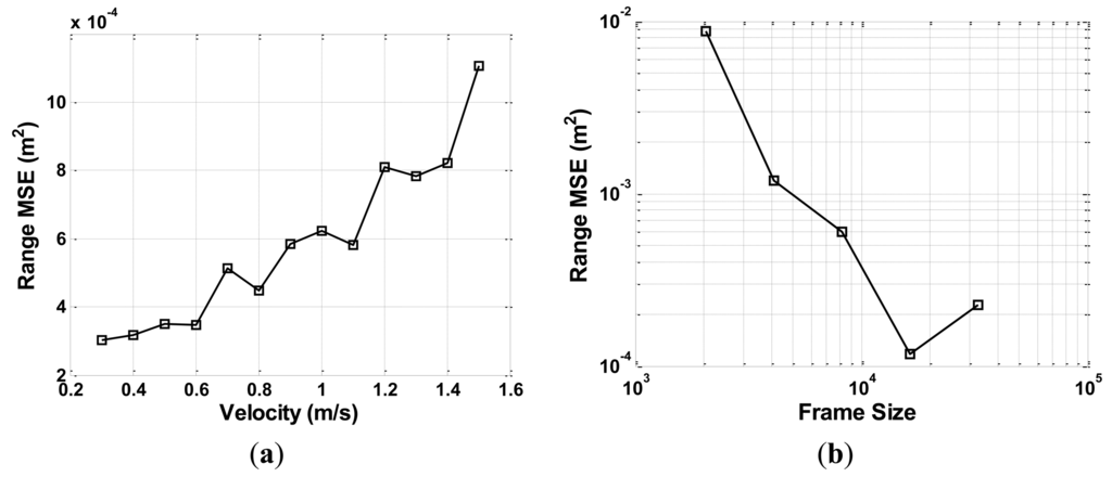 Figure 12(a) indicates how the mean square error (MSE) of corrected range value changes with the velocity of the sonar movement. Thirteen velocity values from 0.3 m/s to 1.5 m/s are tested, with an interval of 0.5 m/s. Figure 12(b) indicates the relationship between the MSE of the corrected range and data frame size, under the velocity of 1 m/s. Five frame sizes, 2,048, 4,096, 8,192, 16,384, and 32,768, are tested. Frame shift is equal to half the frame size. In the aforementioned test results, each value point is an average of six tests at a corresponding velocity, with three approaching movements and three backing-away movements.