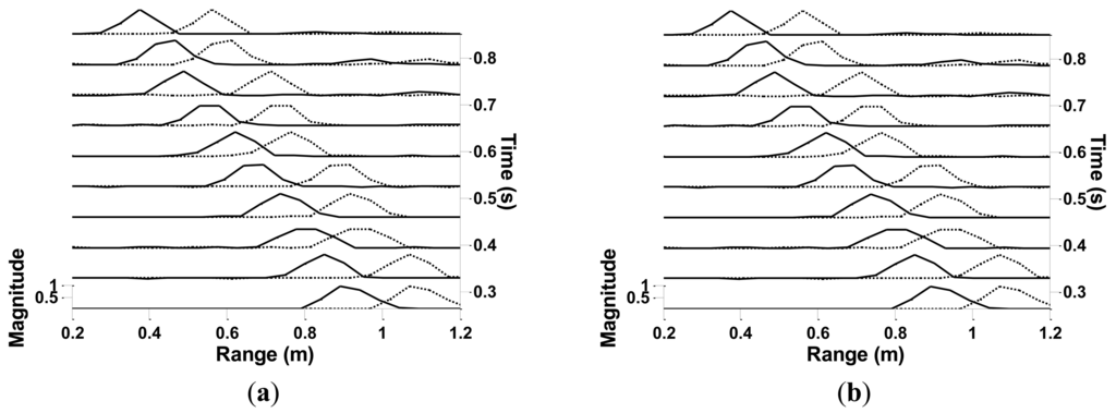 In a moving condition, the range profile is affected by Doppler shift and displacement. Doppler shift does not only cause deviation in the range value, but it also stretches or compresses the range profile. The influence of Doppler shift can be reduced by applying the correction approach to the entire profile data. The experimental result of range profile correction can be seen in Figure 13. However, the influence of displacement still needs to be solved.