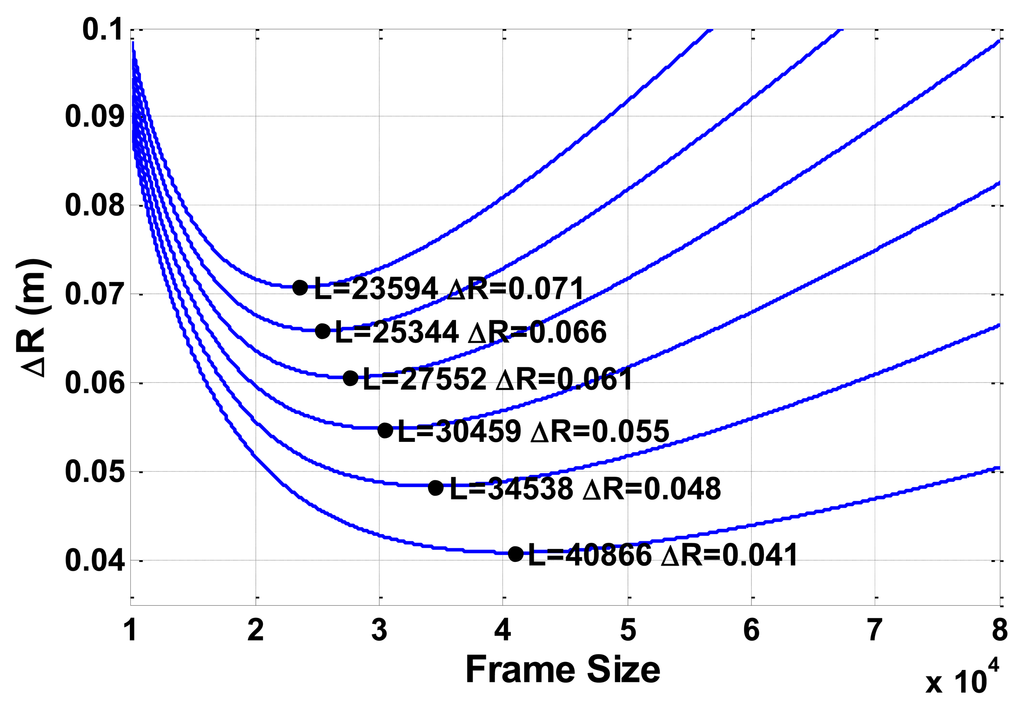 Obviously, Δd and Δr are inversely proportional to each other. To maintain an optimized performance, the system needs to adjust frame size L to balance between Δd and Δr, according to v. For a certain velocity value v and a system with a fixed sample rate, the theoretical minimum distinguishable range interval ΔR between two targets is the sum of Δd and Δr. According to Equations (24) and (25):
