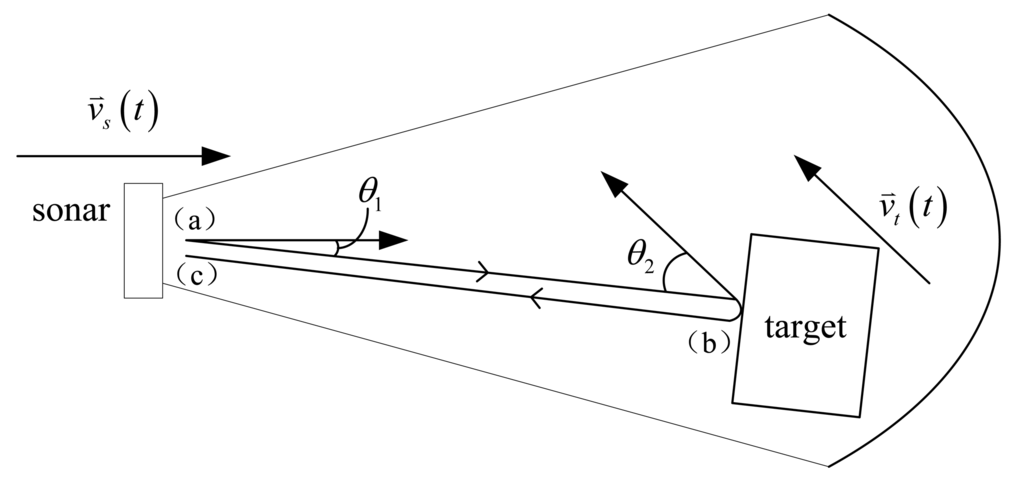 Supposing that an arbitrary signal with an instantaneous frequency of f(t) is transmitted by the sonar, then, only the ultrasonic beam that hits the target and is reflected back to the sonar is considered. The sonar is moving at a velocity vector of at the moment of transmission. The angle between and the beam is θ1. After transmission, f(t) is shifted tof̂1(t) because of the Doppler effect (a) [18]: