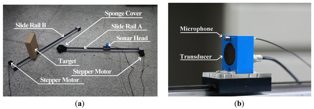 Pictures of the movement mechanism and the sonar head used in the experiments are shown in Figure 6.