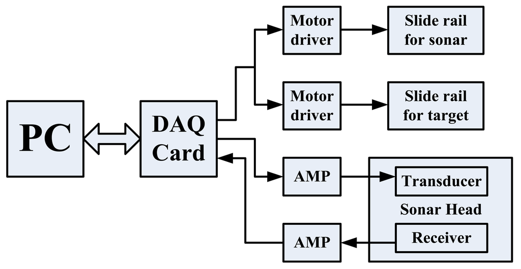 The connections among the apparatuses are shown in Figure 7. The data acquisition card is controlled by the computer through MATLAB software. Two of the analog output (AO) channels are used to export pulse trains to the stepper motors through two motor drivers. Another AO channel is used to export the transmitted signal to the sonar head. An analog input channel collects the echo signal from the sonar head. All the aforementioned signal operations are performed under a sample rate of 1 MS·s−1. Transmitted signal parameters are listed in Table 1.