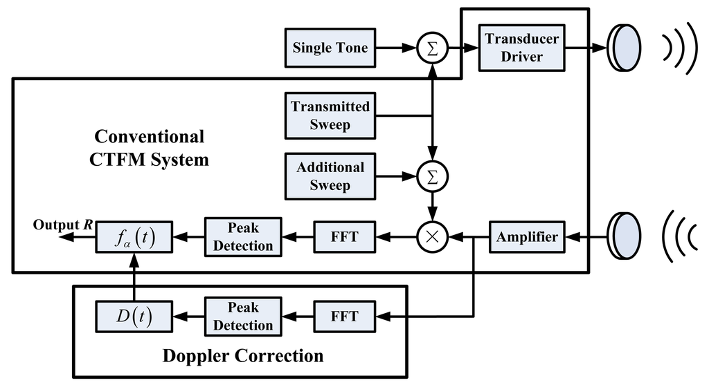 As discussed in Section 3, the deviation of the CTFM output is caused by Doppler shift when relative movement occurs between the sonar and the target. Supposing that the simultaneous motion information of the sonar and the target is available, then the frequency shift of the echo signal can be estimated through geometric calculation. Unfortunately, this information is unavailable in practice. Even if the motion of the mobile agent that carries the sonar can be obtained using velocity measurement devices such as encoders, angle values of the ultrasonic beam during the propagation will remain unknown. In this case, Doppler shift information obtained from the echo signal itself is the best match for the propagation procedure. However, in a CTFM system, signal frequency is changing all the time, thus Doppler shift is also hard to obtain. An idea that inspired the proposed approach is to combine the concepts of a CTFM sonar and a Doppler sonar. The sweep signal of a CTFM sonar and the single tone signal of a Doppler sonar go through the same frequency shift during the propagation. Therefore, they share the same Doppler factor. The factor can be easily acquired by the Doppler sonar, and then used to correct CTFM output.