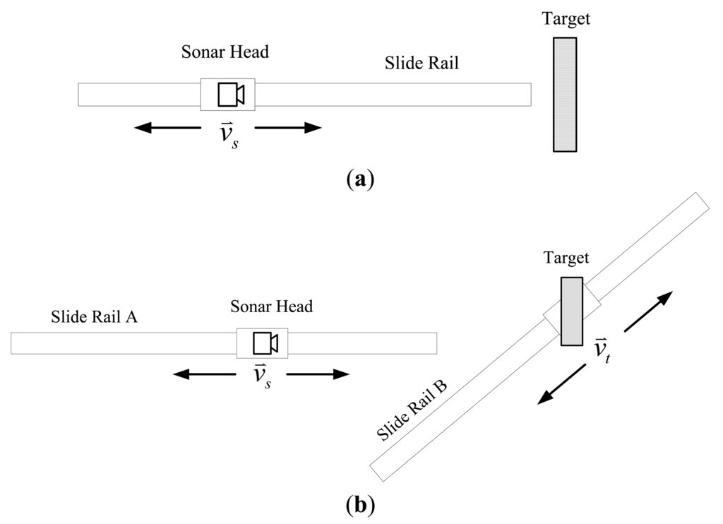In the following experiments, a large frame with 16,384 samples and a short frame shift with 5,000 samples are set up. This setup produces a high frame rate to allow verification of the approach with dense data. Verification experiments are performed in two conditions: (1) the sonar is moving while the target remains still; the slide rail and the target are arranged as shown in Figure 9(a); (2) both the sonar and the target are moving, the two slide rails are arranged as shown in Figure 9(b).