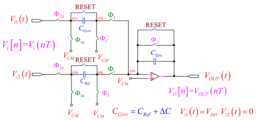 Capacitive sensing circuits are categorized into synchronous [15], switched-capacitor [12,16–18], and fully differential circuits [8,11,19,20]. The transfer functions of the first two are independent of parasitic capacitance, and they can cancel the flicker noise and DC offset voltage to provide high accuracy. The synchronous sensing circuit requires bias control with either a large value off-chip or large-area integrated resistive circuit component [15]. In addition, in the frequency response, the transfer function of the synchronous sensing circuit has a zero point that increases the phase delay so that it cannot control feedback. The architecture of the fully differential sensing circuit is simple and contains no charge cancellation error, but its signals are attenuated by parasitic capacitance [19]. The switched-capacitor circuit technique is based on the realization that the capacitor and switch are equivalent to a resistor for reducing the layout area [16–18]. This technique can realize a variety of other signal-processing blocks, such as gain-stage, voltage-controlled oscillators (VCOs), and modulators. The switched-capacitor circuit can provide stability but it reduces the open-loop gain. In addition, the switched-capacitor circuit provides a virtual ground and robust DC biasing at the sensing node so that the sensed signal is insensitive to parasitic capacitance and undesirable charging. This circuit also offers a wide range of techniques to suppress offset and low-frequency noise, such as correlated double sampling (CDS) and programmable capacitor array (PCA). Thus, this circuit is very suitable for gyroscope measurement. A novel parasitic-insensitive switched-capacitor (PISC) sensing circuit is designed in order to get high sensitivity and ultra linearity and reduce the parasitic effect for the out-of-plane single-gimbaled decoupled gyroscope (SGDG) in this study.