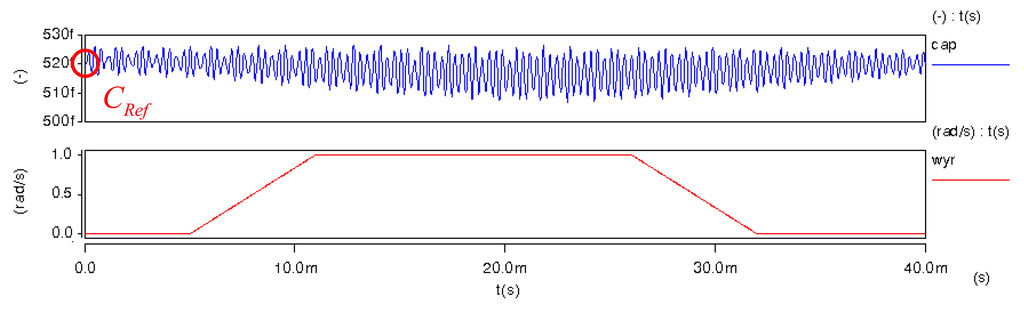 The CRef is the initial capacitance of detection for the gyroscope. The capacitance value is simulated using the CoventorWare FEM simulator. The simulator uses the solid model of the gyroscope (see Figure 10(a)) and its capacitance value is about 516 fF, as shown in Figure 10(b). In addition, we also use the ARCHITECT™ simulator to estimate CRef. It models the mechanical and electrical effects of these rough environments on the out-of-plane SGDG. In ARCHITECT™, we work in a schematic-driven environment using symbols to represent individual components or elements of components, as seen in Figure 11. Typically, these component models are parameterized. The simulation result of electrode capacitance (cap) for the transient analysis is shown in Figure 12. It can be found that the initial capacitance, CRef is about 519 fF when the sensing signal (wyr) is 1 rad/s. The capacitance is calculated to be about 499 fF by the formula. After comparing the three methods, we choose this value of about 500 fF for a convenient layout.