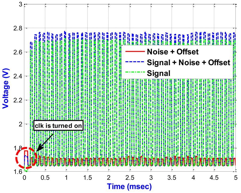 Figure 15 shows the output results of the proposed PISC circuit under different CGyro. When the time reaches 100 μs, the clk in Figure 6 is turned on. From the simulation results, we can see that the proposed PISC circuit starts sampling after clk is turned on. In addition, the PISC circuit with CGyro = 500 fF is mainly for the noise and offset signals. Thus, we can use signal processing to cancel the noise and offset, as shown in Figure 16.