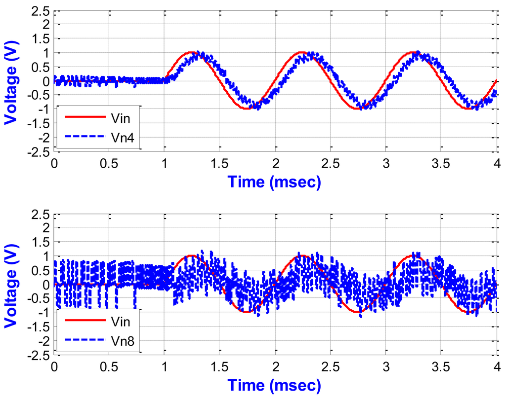 The simulation results of the SDM circuit simulated by HSPICE simulator from nodes of n4 and n8 in Figure 8 are shown in Figure 17 with a sinusoidal input.