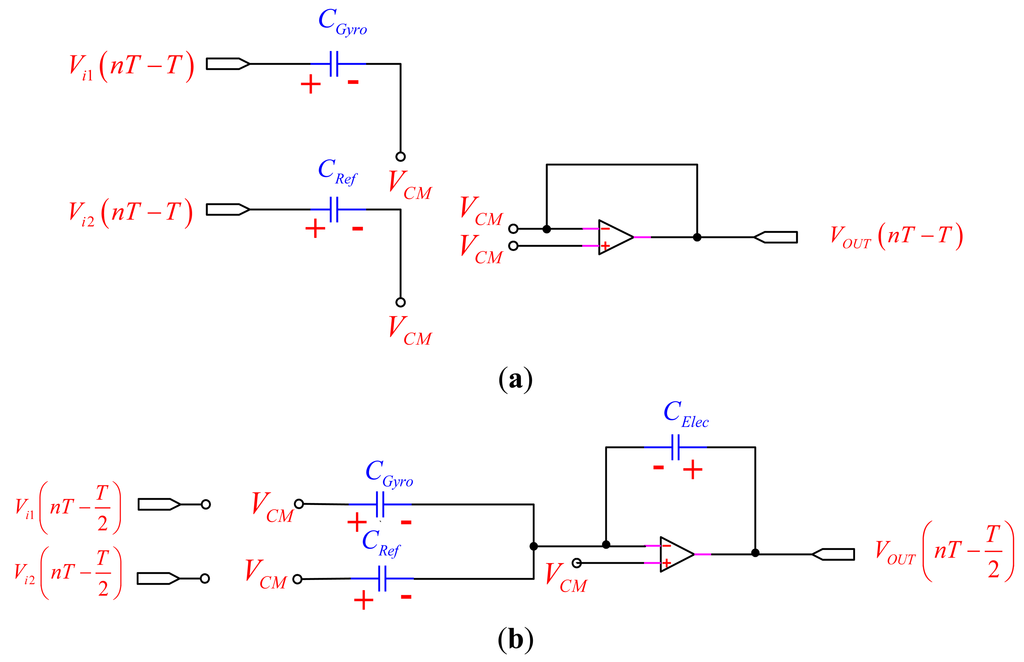 As shown in Figure 2(a), in the sampling mode, Φ2 is on and Φ1 is off, allowing the voltage across CGyro and CRef to track Vi1(t) and Vi2(t) while the operational amplifier (OP-amp) and CElec hold the previous value. In the transition to the amplification mode, the charge stored on CGyro and CRef are transferred to CElec through the virtual ground node, as shown in Figure 2(b).