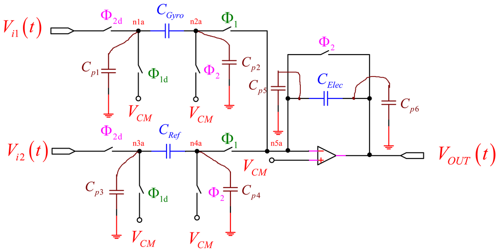 Here, Cp1 is continuously being charged to Vi1(t) and discharged to the common mode (VCM). However, when Φ2 is turned on, the fact that Cp1 is also charged to Vi1(t − 1) does not affect the charge that is placed on CGyro. When Φ1 is turned on, Cp1 is discharged through the Φ1 switch attached to its node, and none of the discharging current passes through CGyro to affect the charge accumulating on CElec. Therefore, it does not affect the circuit operation. In addition, Cp2 is either connected to VCM through the Φ2 switch or to the virtual ground through the Φ1 switch. Since Cp2 always remains discharged, it does not affect the operation of the circuit. Similarly, the operations of Cp3 and Cp4 do not effect as Cp1 and Cp2. The effect of Cp5 on the transfer function is small since it is always connected to the virtual ground of the OP-amp. Finally, Cp6 is connected to the OP-amp output. Although it may affect the speed of the OP-amp, it would not affect the final settling point of the OP-amp output.
