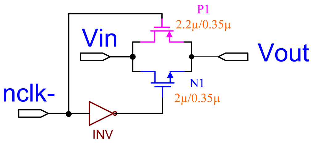 The requirements for switches used in this paper are that they have very high off resistance and low on resistance, and introduce no offset voltage when turned on. In order to achieve the full signal range of 0 to 3.3 V, we used a negative triggered CMOS transmission gate, as shown in Figure 5 [16]. To guarantee that the charge is not inadvertently lost, we adopt the non-overlapping clock, as shown in Figure 6, which is used to eliminate the clock feed-through influence [16,17]. It has two logic signals running at the same frequency and is changed in such a way that at no time are both signals high.