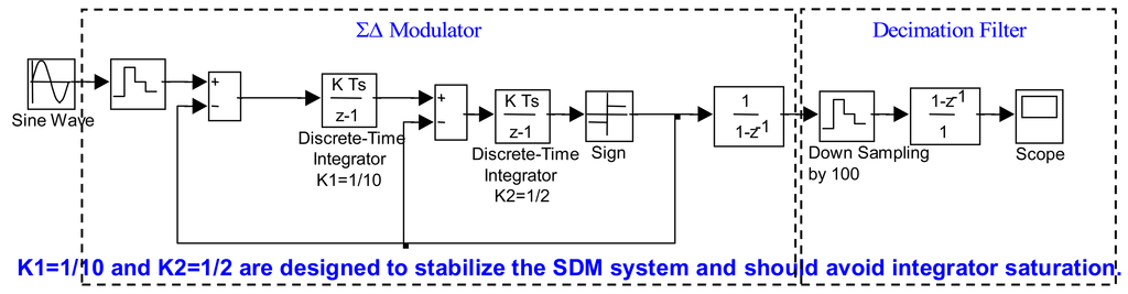 A sensing circuit usually requires an ADC. In general, the output voltage for the sensing circuit is weak and small. A high resolution ADC is necessary for acquiring such a feeble signal. The ΣΔ ADC is the best choice for this application. It uses the over-sampling principle, noise shaping and decimation filtering to achieve the high resolution. It consists of a ΣΔ modulator and a decimation filter. In addition, the ΣΔ ADC operates in the discrete-time domain and is implemented using the switch-capacitor circuit technique. The switch-capacitor circuit can only be realized in MOS devices, not in bipolar transistors. In other words, the sensing circuit fabricated in the digital CMOS process is suitable for generating the digital output using ΣΔ ADCs. The behavior simulation model shown in Figure 7 is adopted for the ΣΔ modulator design to avoid the integrator overload and to satisfy the system requirements. The design is the second order ΣΔ modulator with a one-bit quantizer. The decimation digital filter is implemented by down-sampling and a comb filter. The discrete-time integrator parameters of K1 and K2 for the ΣΔ modulator are 0.1 and 0.5, respectively.