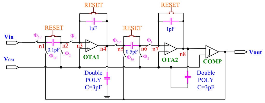 The circuit design for the ΣΔ modulator is shown in Figure 8. Here, “OTA1” and “OTA2” are folded-cascode OP-amps, as shown in Figure 4. The “COMP” indicates the comparator circuit, as shown in Figure 9. The “RESET” switches are only utilized for discharging the capacitors initially. The circuit is implemented using the switch-capacitor technique and controlled by a non-overlap clock circuit, as shown in Figure 6, which is used to eliminate the clock feed-through influence.