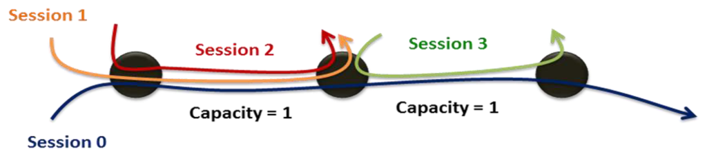 Past research has dealt with how to optimally allocate limited resources through maximizing utility under various constraints. Limited research, however, has considered fairness in a live communication network environment. In [11], “fairness” has three definitions: max-min fairness, proportional fairness and balanced fairness. These three criteria evaluate fairness based on the channel conditions of various subscribers. The max-min fairness concept proposed by Kleinberg, Rabani and Tardos [12] incorporates the selection of routing paths, the allocation of bandwidth and the improvement of system utilities. In short, achieving max-min fairness means optimally allocating resources under the worst conditions until the system utilities are specified. From [13], Max-min fairness can be defined as: “A rate r is said to be max-min fair if it is feasible, and for each session p ∈ P, the allocated rate for session p, rp, cannot be increased while maintaining feasibility without decreasing rp′ for some session p′ for which rp′≤ rp”. Figure 2 can illustrates the max-min fairness, which means the max-min fairness means maximizing the allocation for the most poorly treated of those other sessions, and so forth, until all allocations are specified. The summation of traffic Session 0, 1, and 2 will be approached to the link capacity and each session has the same QoS conditions.