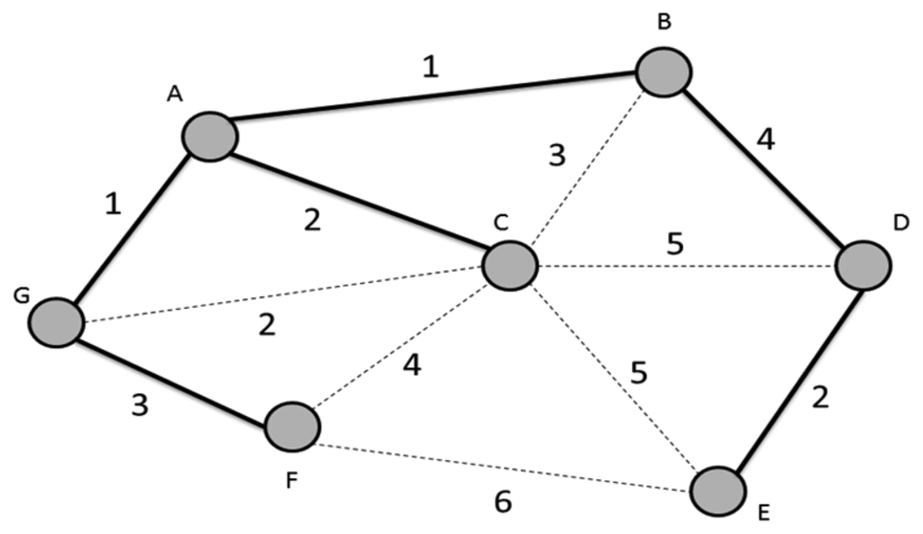 In [16,17], Bazlamaçcı and Hindi propose a definition of minimum spanning tree (MST; or minimum weight spanning tree which is shown as Figure 3. MST and minimum weight spanning tree involve locating an undirected spanning tree in which the sum of the weights of the selected edges is minimum. Most works often use a simple incremental and greedy method to solve MST problems. In a greed method, the MST is built edge by edge until the best possible edge is chosen for inclusion in the MST without cycles or disconnecting in the sub-graph. The theoretical and algorithmic performance vales are compared and observed to determine the effects of network size changes. The theoretical bounds are determined by the development of an efficient MST algorithm. However, in 2002, Pettie and Ramachandran [17] proposed an optimal Minimum Spanning Forest (MSF) algorithm composed of multiple minimum spanning trees. The complexity is equal to its decision-tree complexity, O(T × (m, n)), where there are n nodes and m edges. The algorithm runs in linear time with high probability for all possible edge-weights on random graphs. The time bound ultimately depends on the edge-weight needed to determine the MSF [18]. The remaining problems of the algorithm concern the determination of worst-case complexity.