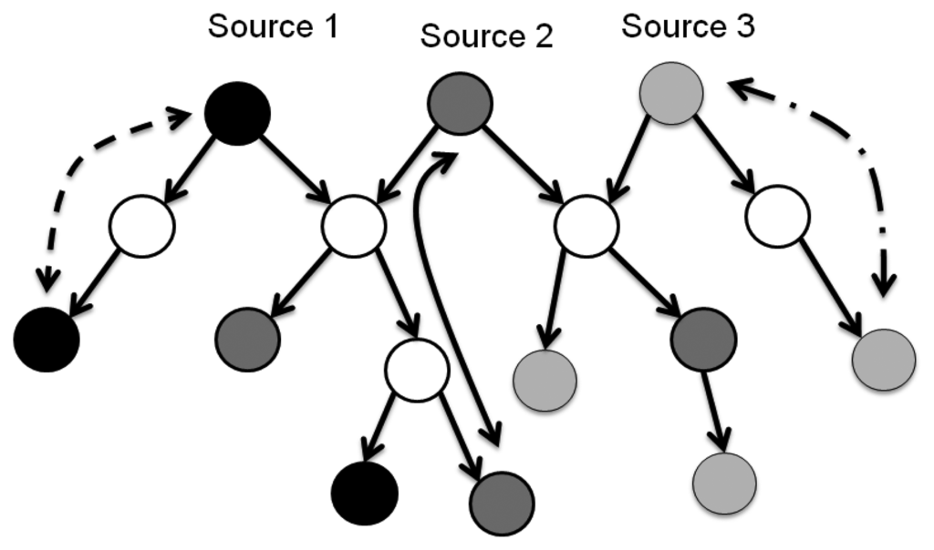 Wireless Sensor Network (WSN) applications such as the Internet of Things (IoT) are an integral part of the Future Internet that could be defined as a dynamic global network infrastructure with self-organization capabilities that is seamlessly integrated into the information network based on standard or interoperable communication protocols. This attracts more attention to how sensor nodes can monitor and cooperatively pass their data like temperature, sound, pressure, etc. more efficiently through the network under realistic physical or environmental conditions. For example: the environment could be a scale free data sampling area like groups of lakes, high mountains with original forest, or the environment is so inaccessible that humans can't get the sampling data in the short term. A survey shows that a few networks only have one existing sink node, called a tree, but other multi-sink networks exist in some specific applications, called a forest, which are more indispensable in WSNs. Figure 1 shows a scenario illustrating that common unicast routing protocols will set up separated routes from sink node #1, 2 to sensor node #1∼6, denoted by the dashed lines, but it is obvious that if multicast technology could be used, it would be a better, more energy-efficient way to suppress the duplicate transmissions of same data packets and another nodes which are not included in multicast groups could be put into power saving mode, indicated by the real lines.