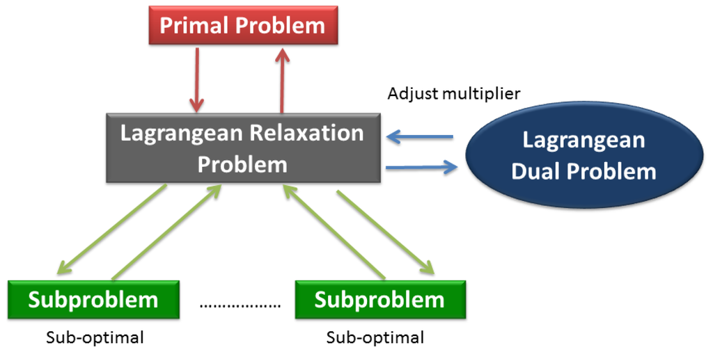 The Lagrangean Relaxation method had proposed since early 1970s for use in large-scale mathematical programming applications [20,21]. The Lagrangean Relaxation method is flexible and effective for solving optimization problems such as integer programming, liner programming with combinatorial objective function, or non-linear programming problems.