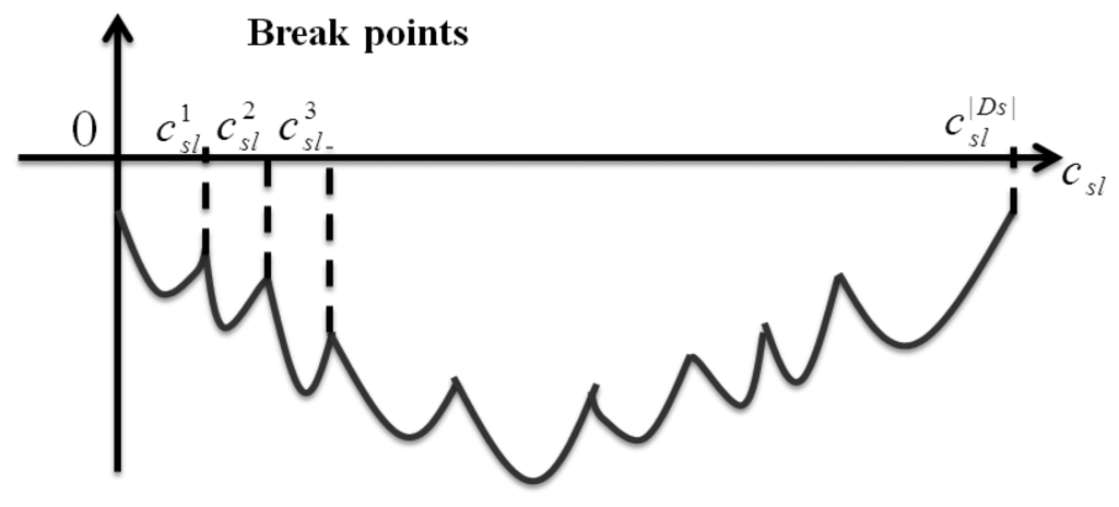 Figure 9. An example of Subproblem 3 considering csl.Step 2: Sort these breaking points and denote them as with the sequence from smallest to largest.