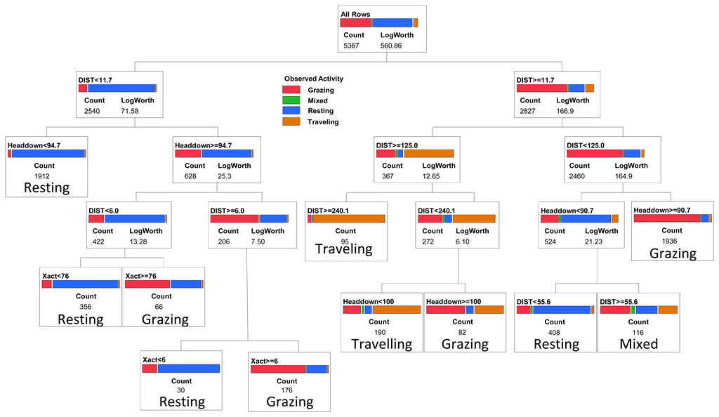 Other primary sources of error in our classification tree included: (1) animals traveling with their head down, which could be mistakenly classified as grazing; (2) animals standing with their head down, which could be mistakenly classified as grazing, and (3) animals grazing in a small patch with small net movement distance, which could be mistakenly classified as resting. The model did effectively distinguish between resting and traveling, primarily on the basis of the distance travelled with a 5-minute interval. For some applications, this may provide a more valuable classification of cattle activity than a binary model that only discriminates grazing vs. non-grazing activity.
