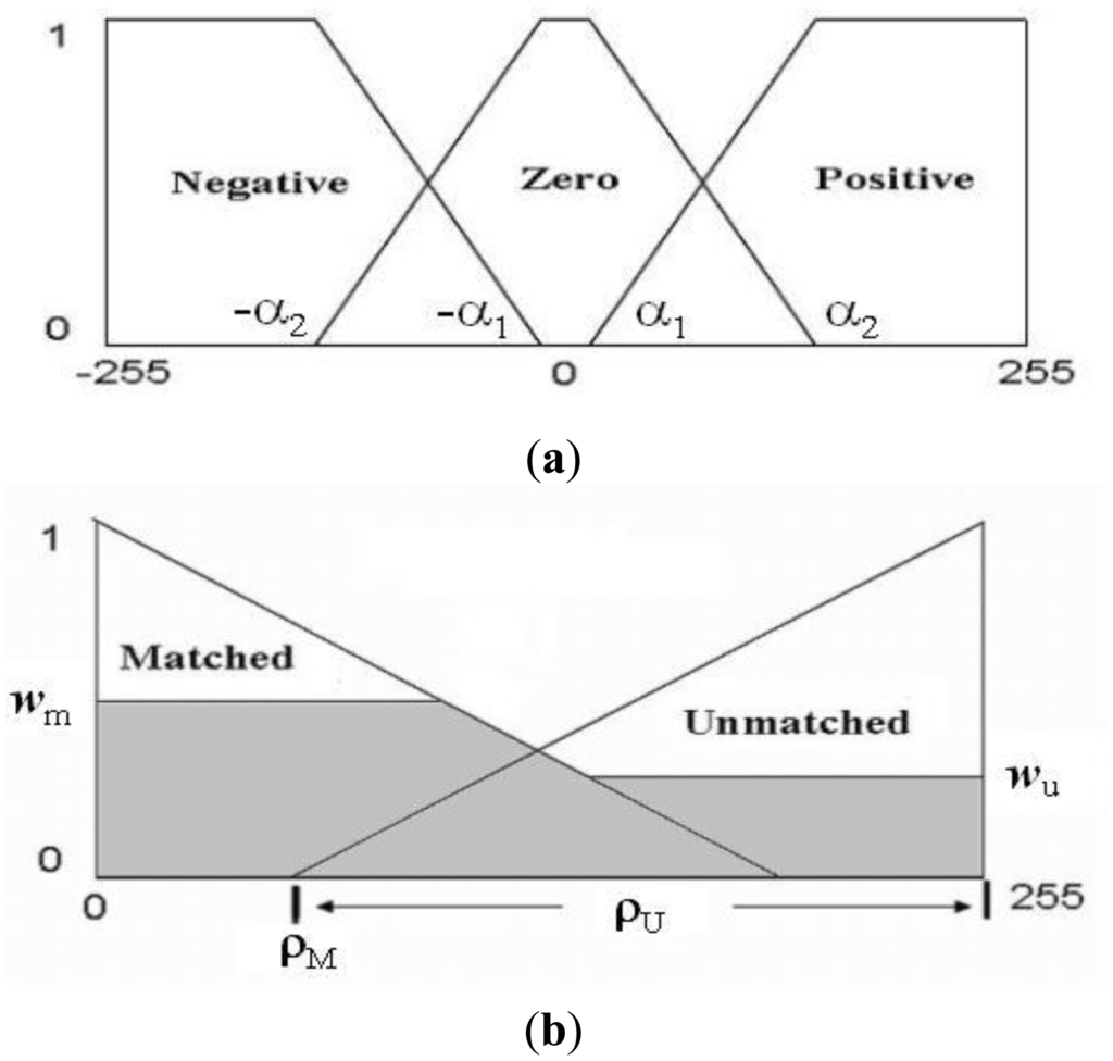 Figure 10(b) shows the membership functions (μM(x), μU(x)) for the output fuzzy variables (Matched, Unmatched) defined by: