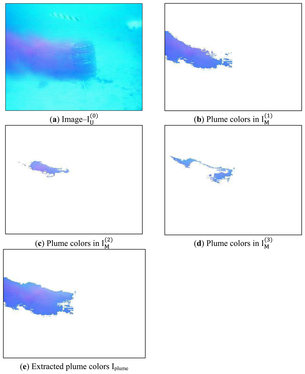 The difficulty of segmenting the chemical plume and its source from images taken in ocean environments lies in the definition of their color patterns, since colors in the vague images are not well defined due to illumination variance and fluid advection affects. Now, we discuss an iterative procedure to extract the rhodamine dye plume and its source from such a color image taken in near-shore oceanic environments. For convenience, we define two groups of the sub-images and split by FCE. contains matched colors after the ith step extraction, while contains unmatched colors. The original image is the initial source image to the procedure, and is the source image for the (i + 1)th step segmentation. We have the relationship . In our application, a default color is defined as white with (255, 255, 255) in the RGB space. FCE generates by moving the matched pixels from the source image to an image initialized by white color, and generates by setting the extracted pixels in the source image to white color. Obviously, selecting color patterns becomes the key issue of extracting desired objects from an image. We employ some well-defined colors as reference colors to generate CPs. To our knowledge, the color components of the rhodamine dye plume are close to the red color, and those of the chemical source are dark and close to the blue color. Therefore, we define the two reference colors: REDRGB with (255, 0, 0) and DARK-BLUERGB with (BLACKRGB+BLUERGB)/2 = (0, 0, 128) to generate color patterns by using GetCP( Is ):