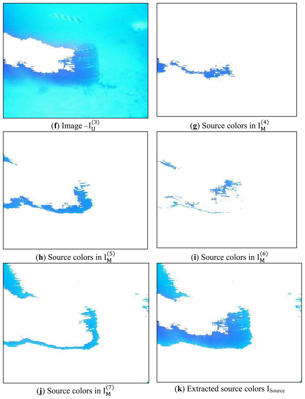 Similarly, we use FuzzyColorSeg to extract the color components of the chemical source from the image. In this case, DARK-BLUERGB is assigned to RefColor to generate a CPRGB. FCE uses this CPRGB split into two sub-images and , as shown in Figure 11(f). This procedure continues four steps to extract the color components of the chemical source, as shown in Figure 11(f–j). The union operation generates the extracted color components of the chemical source shown in Figure 11(k).