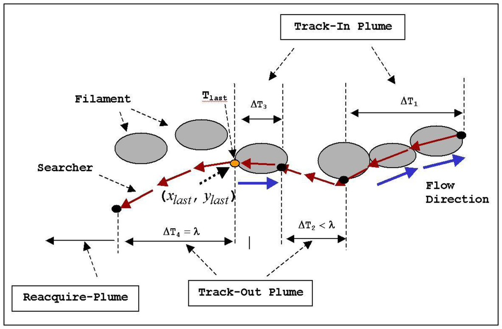 Most of the existing studies have mainly focused on the plume tracing issue and validated their algorithms in a small operation area in a range of centimeters to a few meters or in a simulated environment, but they lacked detailed reports of CPT experiments in natural environments on a large scale. The tracking of a chemical plume in the natural environment, such as near-shore oceanic conditions, where the plume is developed under the influence of turbulence, tides and waves, challenges CPT algorithms on how to cope with the intermittency of filaments and significant plume meander. The lack of correlation between the fluid flow direction and the plume long axis often causes an AUV to lose contact with the plume because the instantaneous fluid flow direction within a plume with significant meander is not always aligned with the plume's long axis [10]. Conducting CPT missions in near-shore ocean environments on a large scale has to consider the full spectrum of field behavior that include plume finding, plume following, maneuvers to recontact a lost plume, and declaration that the source has been found [2]. Li et al. proposed a subsumption architecture for CPT missions [11], consisting of these four fundamental behaviors: finding the plume, maintaining the plume, reacquiring the plume, and declaring the source location or identifying the source location.