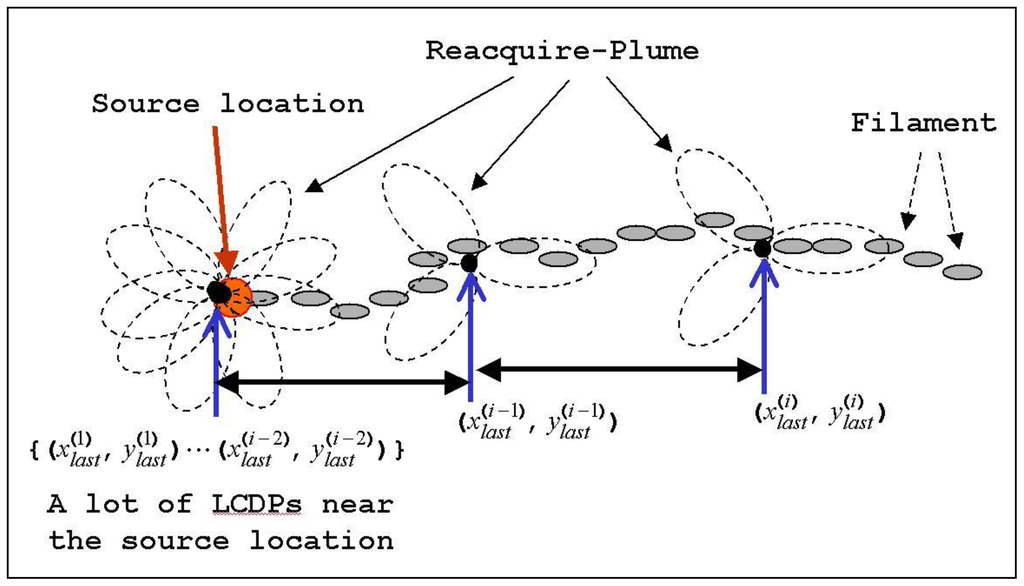 In the moth-inspired CPT strategies, the chemical sensor works as a “binary detector”. The Boolean value is “1” if the chemical concentration is above the threshold. Otherwise, the Boolean value is set to “0”. The threshold value was chosen as conc > 4% of the full scale (i.e., 0.2 V) based on an analysis of chemical sensor data from the REMUS operating in San Diego Bay in the absence of the chemical. In this scenario, the sensor readings were pure noise, but never surpassed 0.2 V. The proposed algorithms make the source identification decision based on the number of LCDPs in SIZ instead of their concentrations. LCDPs provide important information about plume traversal distances between Reacquire-Plume activities. The LCDPs are separated along the axis of the plume when the AUV is far from the source location, while the LCDPs are clustered in the vicinity of the source when the AUV is approaching the source location. The AUV usually exits the plume and moves up flow from the source when it traces the plume to the source location. When this situation occurs, the AUV also activates Reacquire-Plume to rediscover the plume on a Cloverleaf trajectory. As a result of the frequent switching between Maintain-Plume and Reacquire-Plume, the AUV generates a pattern with a number of Cloverleaf trajectories in the vicinity of the source location, as shown in Figure 4(b). Such a distribution of the LCDPs is employed to facilitate development of the source identification algorithm.