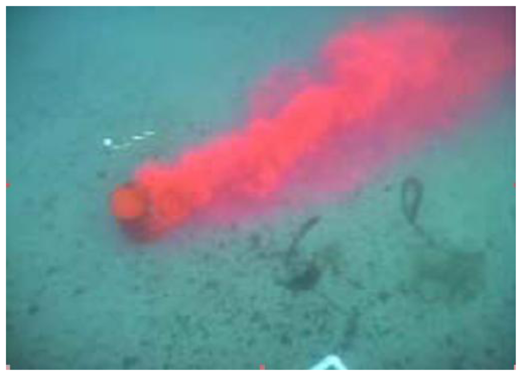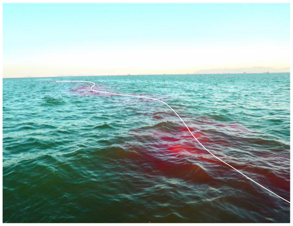 For the in-water tests conducted in October 2010 at Dalian Bay (China), we developed an alternative strategy to generate rhodamine dye plumes on the sea surface, instead of on the seabed. The rhodamine dye is pumped up to the sea surface through a wound drainage plastic pipe. The pump was placed on a small boat that is anchored to the sea bottom. The plume source is 1.0 meters × 0.5 meters and the chemical source is submerged 1.5 meters below the sea surface. The rate of release of the rhodamine dye is about 1–2 g/min. Figure 9 shows a snapshot of the chemical plume taken at a location about 350 meters from its source. The scenario in Figure 9 provides the following information: first, a significant plume meander appears when the plume is propagated over a long distance. Changes in fluid flow direction cause the plume to meander (forming a snakelike path). Because the fluid flow direction and magnitude change, spatially and temporally, the instantaneous fluid flow direction within the plume often will not point toward the plume's source nor be coincident with the plume's centerline. To our knowledge, most of existing plume tracing algorithms do not explicitly discuss how to deal with the plume meander issue. Second, fluid flow waves affect the rhodamine dye plume so that the chemical concentration distribution is not uniform. The rhodamine dye plume in Figure 8 shows the chemical concentration at some locations where the plume looks like it is broken and the color is very low, but at other locations with a large dye area the level of deep red color is very high. The problem with local concentration maxima significantly challenges source declaration algorithms which are investigated in laboratory environments by searching for the maximum proximity of a plume with a uniform concentration distribution. For identifying the source locations, the AUV started tracing the rhodamine dye plumes developed on the sea surface. In this case, we visually observe the AUV maneuvers and confirm the identified chemical source locations via a GPS. Two among the six test runs aborted due to equipment failure instead of the SIZ_F settings. The mission, labeled as MSN171639, successfully tracked the chemical plume to its source location and identified the source locations with accuracy 8.38 m relative to the source locations confirmed by the GPS, as shown in Figure 2. The declared source location accuracies of the missions, labeled as MS10171617, MS10191502, and MS10191536, are 15.77 m, 12.33 m, and 28.42 m, respectively. The work in [12] developed a time metric to estimate the identification time cost (Nmin−1)*κ which is free from plume mission initial positions. κ is about 94.5 s, determined by the vehicle velocity and turn radius. The identification time costs’ average is close to the estimated one. The source declaration algorithms allow little room for the improvement of time cost if only a single chemical sensor is used.