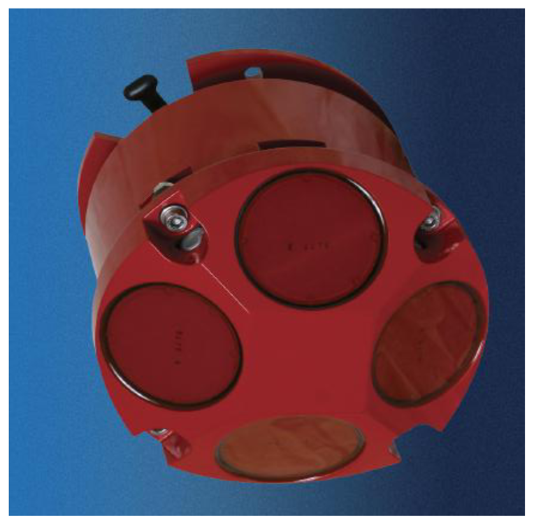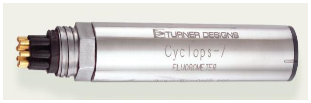 The most recent in-water tests for identifying rhodamine dye plume sources were conducted in October 2010 at Dalian Bay (China). For this set of field tests, we implemented the SIZ_F algorithm on the AUV developed by SIA. The parameters εF =6 and Nmin= 6 in SIZ_F are optimized in [12] prior to the 2012 CPT missions. The AUV shown in Figure 6 is equipped with multiple sensors, including a depth sensor, an underwater fluorometer, and a Doppler Velocity Log (DVL), etc. Figure 7 shows the fluorometer Cyclops-7 produced by Turner Designs, Inc. (Sunnyvale, CA, USA). Its technical specifications can be found at http://www.turnerdesigns.com/products/submersible/cyclops-7. The AUV uses the fluorometer to detect rhodamine dye plume concentration. For the in-water tests, we set the sampling rate of the fluorometer as 10 Hz and choose the 0–10 ug/L measurement scale in which the fluorometer outputs 5 VDC corresponding to a rhodamine dye concentration of 10 μg/L. Figure 8 shows the workhorse navigator 1200K DVL produced by Teledyne RD Instruments (Poway, CA, USA), and its technical specifications can be found at http://www.rdinstruments.com/pdfs/wh_navigator_ds_lr.pdf. The DVL measures the AUV speed relative to the sea bottom based on which we use the dead reckoning method to estimate AUV positions as well as fluid speed and orientation.
