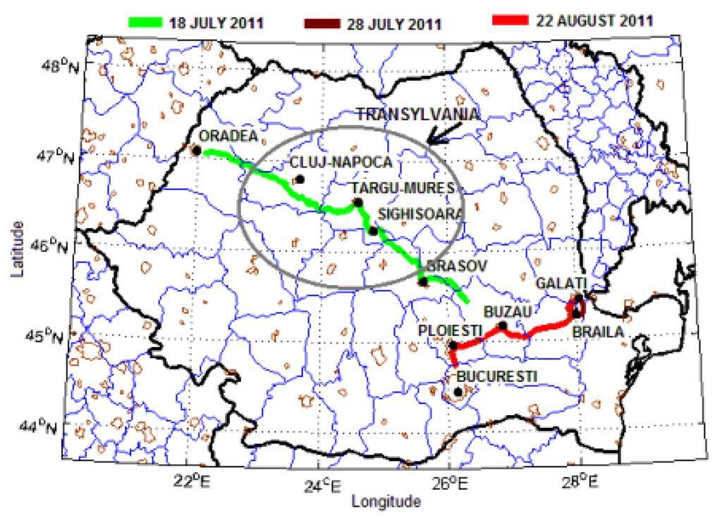 Mobile DOAS zenith-sky measurements were performed in Romania during three days in summer 2011: July 18, July 28 and August 22. The measurements covered about 800 km in different regions of the country, including urban, rural and industrial areas (Figure 1). All measurements were performed under clear sky or mostly clear sky conditions. The time interval of measurements, the distance traveled and the main cities on road route are presented in Table 1.