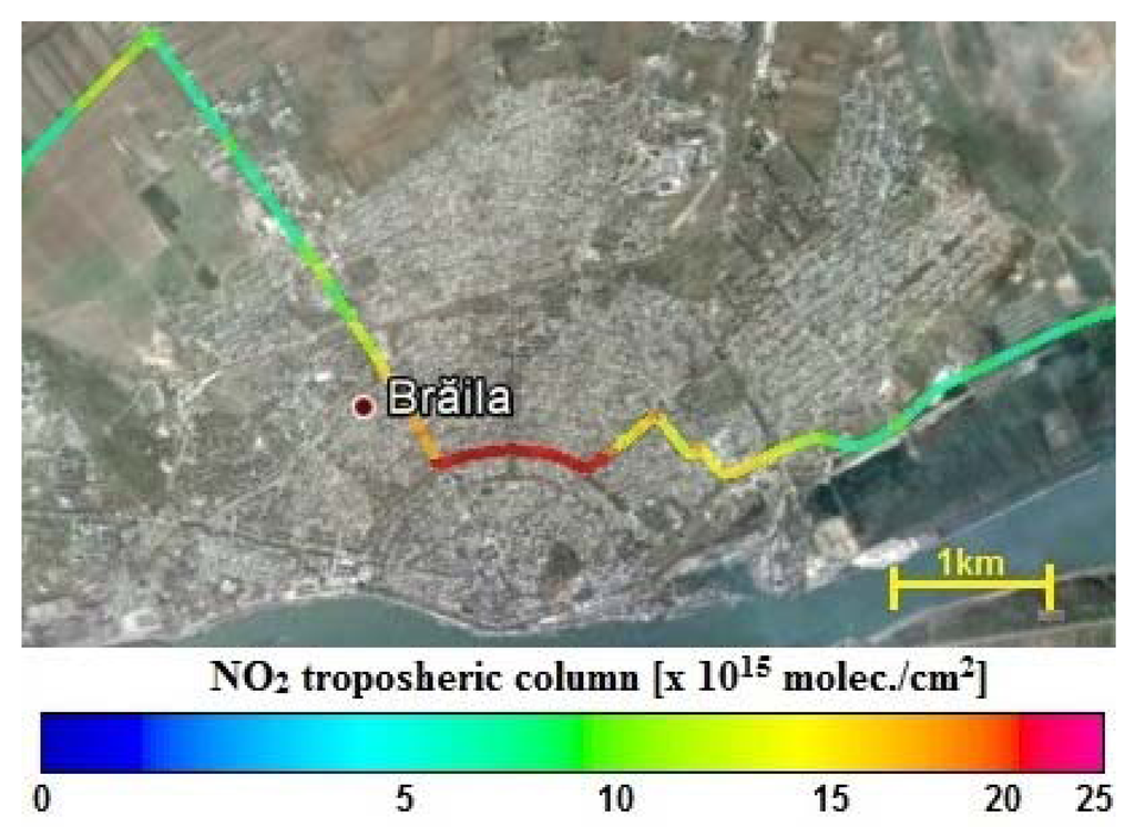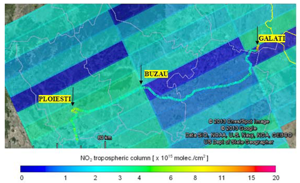 Figure 12 shows a “zoom” inside of an OMI pixel made by mobile DOAS measurements in Braila city on 28 July 2011. Braila city is a relatively small city (77.9 km2), whose main source of atmospheric pollution is due to local transportation. The maximum mobile tropospheric NO2 column recorded is (2.5 ± 0.5) × 1016 molec./cm2 and its corresponding average for an OMI pixel is (4.9 ± 1.2) × 1015 molec./cm2. For the same area, OMI reports a column of about (2.4 ± 1.3) × 1015 molec./cm2. The significant difference between OMI and mobile DOAS measurements is probably caused by the smoothing effect inside the pixel. The total surface of an OMI pixel is 312 km2 which is 4 times larger than the area where local transportation increases the NO2 content. The size of the satellite pixel and the magnitude of the hot-spot are most likely responsible for these discrepancies.